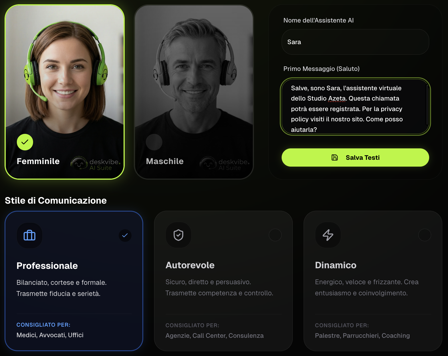 Gli altri ti danno una voce uguale per tutti. Con Deskvibe AI Suite scegli in due clic: voce maschile o femminile e lo stile conversazionale che rappresenta il tuo brand. Nessun pannello tecnico, nessun parametro da configurare. Tu decidi come vuoi che il tuo assistente si presenti — e l'IA fa il resto.