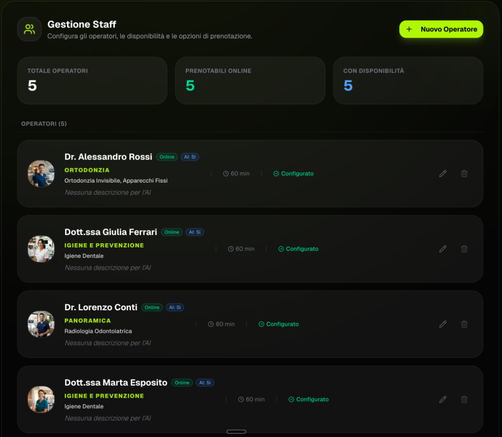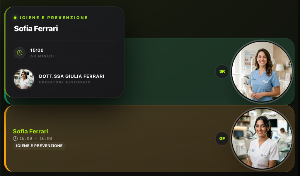 "Prima perdevamo almeno 15 chiamate al giorno durante le visite. Ora l'AI gestisce tutto: prenotazioni, urgenze, spostamenti. In 3 mesi abbiamo ridotto i no-show del 40%."
