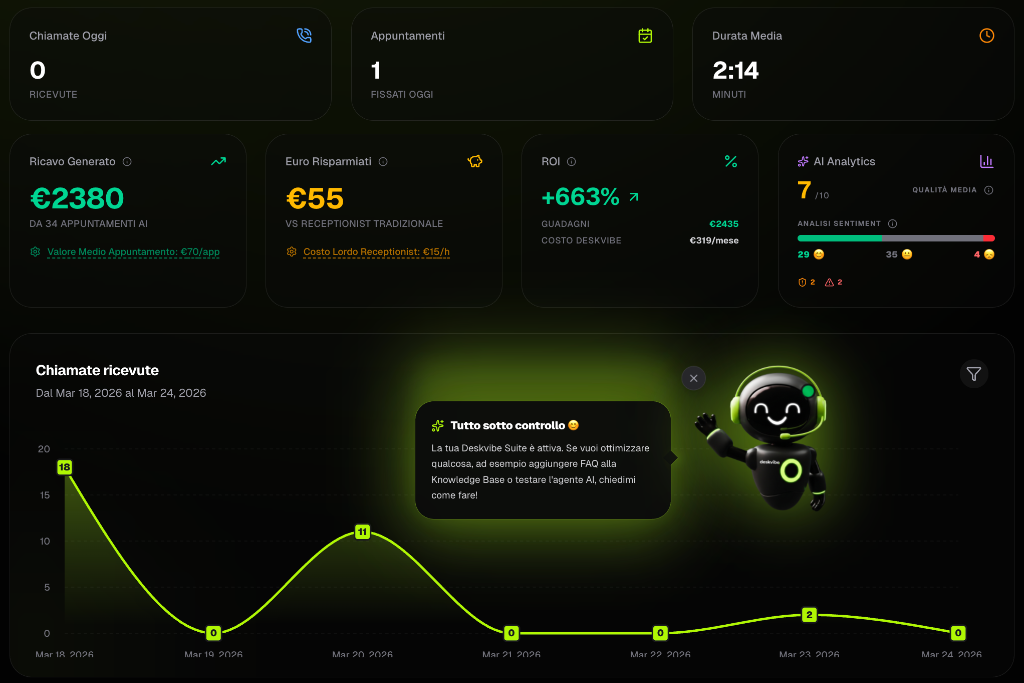 La maggior parte risponde al telefono e basta. Deskvibe AI Suite è una piattaforma completa che gestisce, organizza e fa crescere la tua attività.