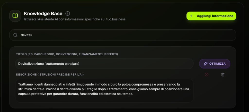 Istruisci la tua AI caricando PDF o l'URL del tuo sito. L'assistente apprende ogni dettaglio della tua attività per gestire le chiamate con competenza assoluta.