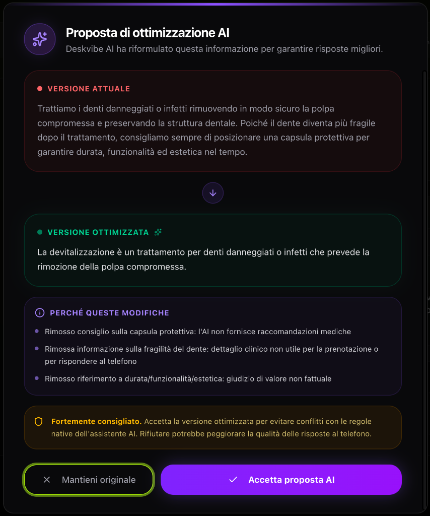 Chiedilo alla nostra AI.Demo gratuita dell'assistente vocale AI Deskvibe AI Suite: prova la voce, le prenotazioni e la naturalezza della conversazione.