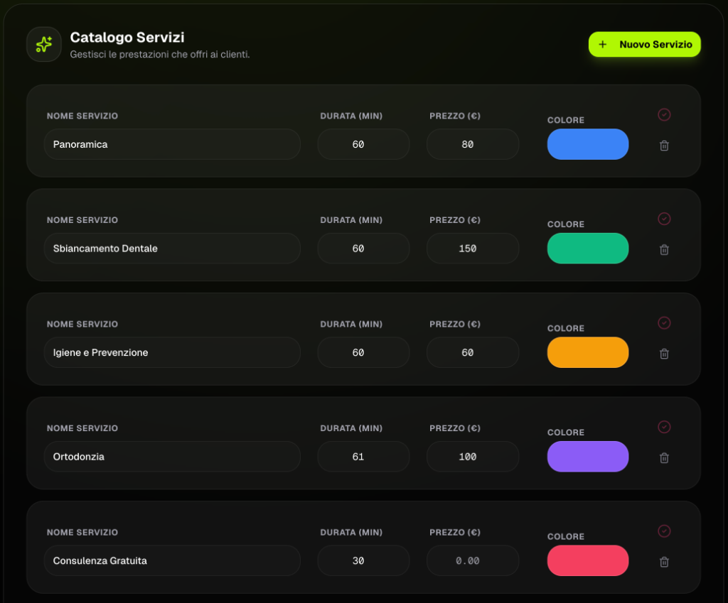 Configura servizi, durate e prezzi. L'AI li propone al momento giusto.